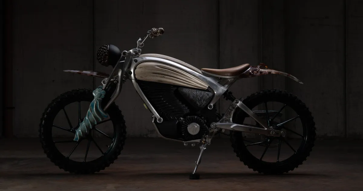 MOTOTOTEMは、FLYING FLEAのFF.C6モデルをベースに、自然素材を巧みに使用した独創的なカスタムバイクです。鍛造アルミフレームやガーダーフォーク、マグネシウム製バッテリーケースなど、高度なテクノロジーと美術が絶妙に融合しています。テーマは「持続可能性」と「革新性」ですが、名だたるアーティストの手によることで、単なるモーターサイクルの枠を超えた一つのアート作品としての存在価値を持つものとなっています。