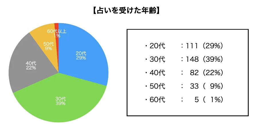 調査対象は2024年から2025年にかけて占いを利用した男女で、379人に対して実施されました。アンケートの参加者は、女性が77%を占め、年代別に見ると30代の割合が最も多く、20代から40代で全体の90%を占める結果となりました。