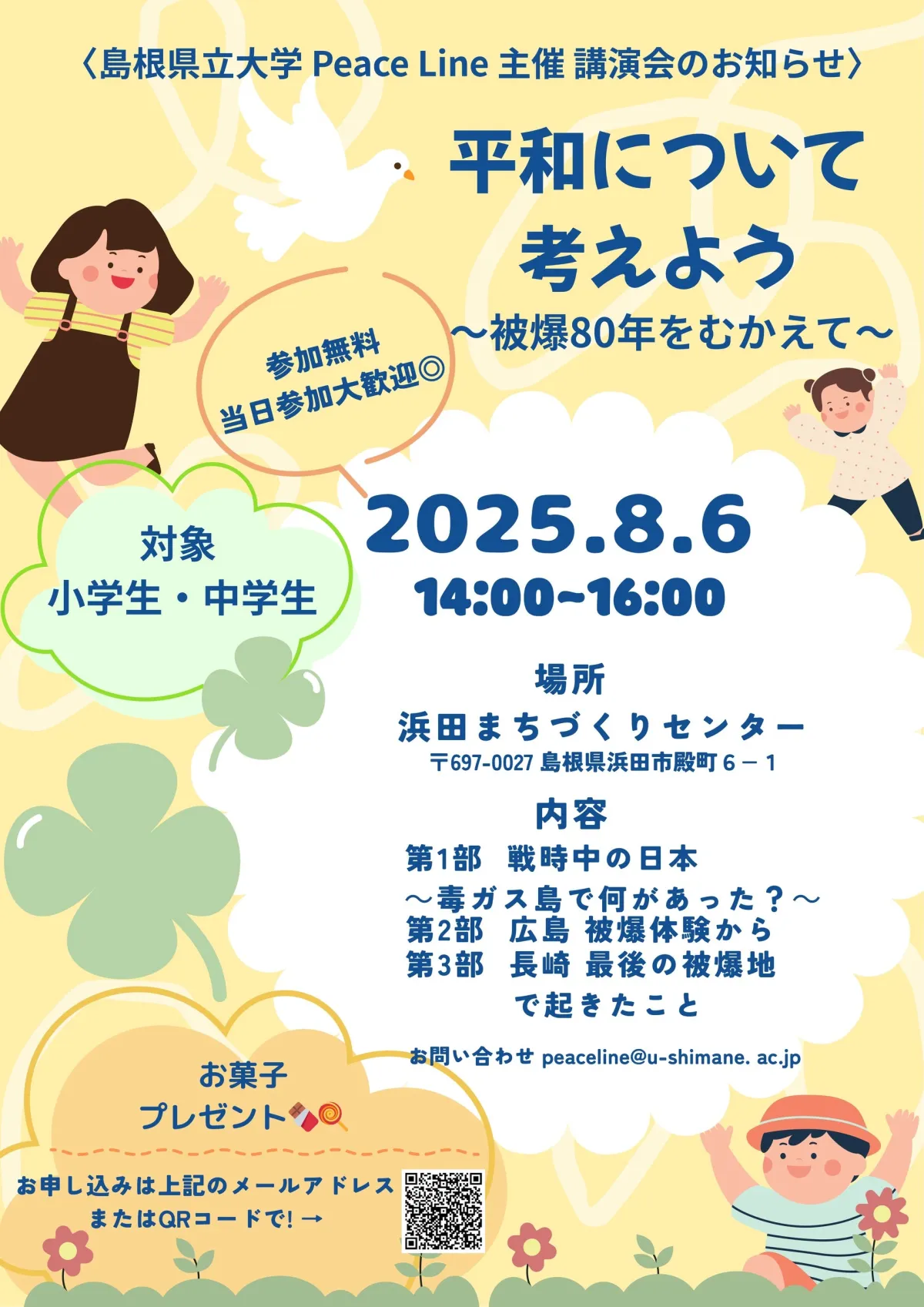 講演会のタイトルは「平和について考えよう~被爆80年をむかえて~」です。時間は午後2時から4時まで、開催場所は浜田まちづくりセンター(住所:島根県浜田市殿町6-1)です。イベントは小中学生を対象としており、次世代のための平和教育の大切さを訴えます。