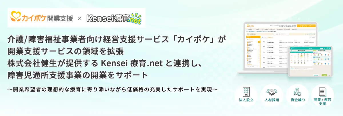 この提携により、障害児通所支援事業に特化した「カイポケ開業支援×Kensei療育.net」が提供されます。この新しいサービスは、法人設立や人材採用、備品・設備の導入、運営支援など、開業準備から運営までを幅広くサポートします。