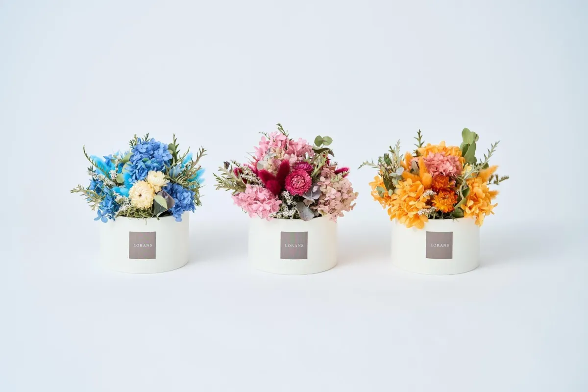 ドライフラワー製品は、特に多くのスタッフが関わるため、作り手の温もりを感じられる商品です。むずかしいと思われる方でも、吸水性スポンジに花が挿さっており、すぐに飾れる実用性があります。