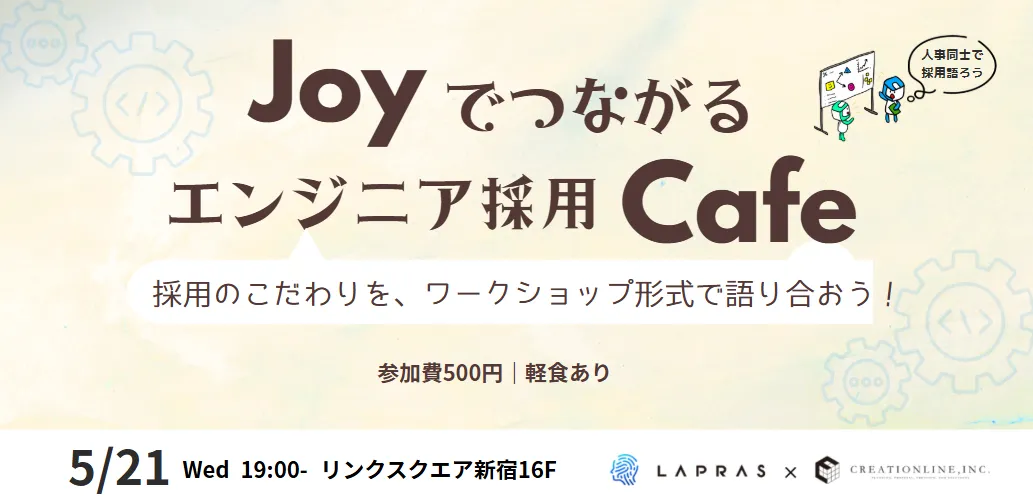 東京都渋谷区で、エンジニア採用に関わる全ての方々が集う新たなイベント「Joyでつながるエンジニア採用Cafe」が始まります。このイベントは、LAPRAS株式会社とクリエーションライン株式会社の共催によるもので、参加者が情報を共有し、交流を深めることを目的としています。まず第一弾として、テーマ「採用のこだわりを、ワークショップ形式で語り合おう!」でイベントが計画されています。