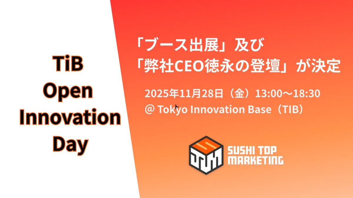 株式会社SUSHI TOP MARKETINGは、2025年11月28日(金)にTokyo Innovation Base(TIB)で開催される「TIB Open Innovation Day」に参加すると発表しました。当日は、弊社のCEOである徳永大輔が登壇し、過去の東京都との協働経験を基にしたパネルディスカッションを行います。また、弊社のブースでは、NFTの取得方法や自社サービスのデモンストレーションを通じて直接体験できる機会をご用意しています。