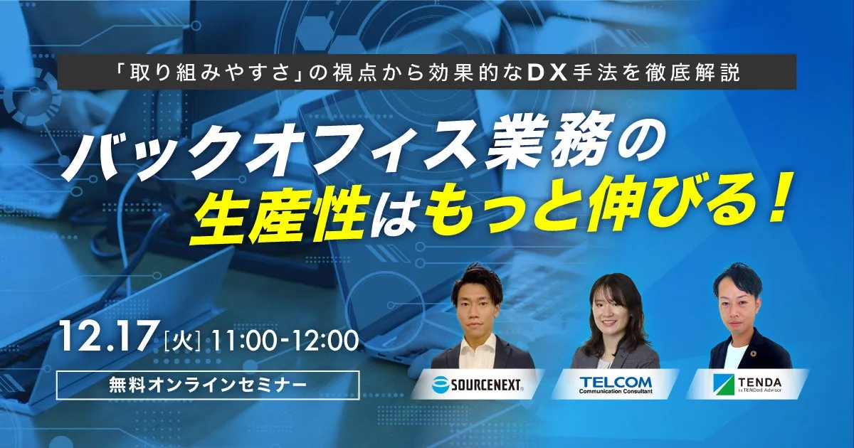 テンダ、テレコム、ソースネクストの3社は、総務部の職務に従事する方々を対象としたウェビナーを開催します。ウェビナーのテーマは「バックオフィス業務の生産性はもっと伸びる!」で、2024年12月17日の火曜日に行われます。このイベントは、事前申し込み制で参加費は無料です。