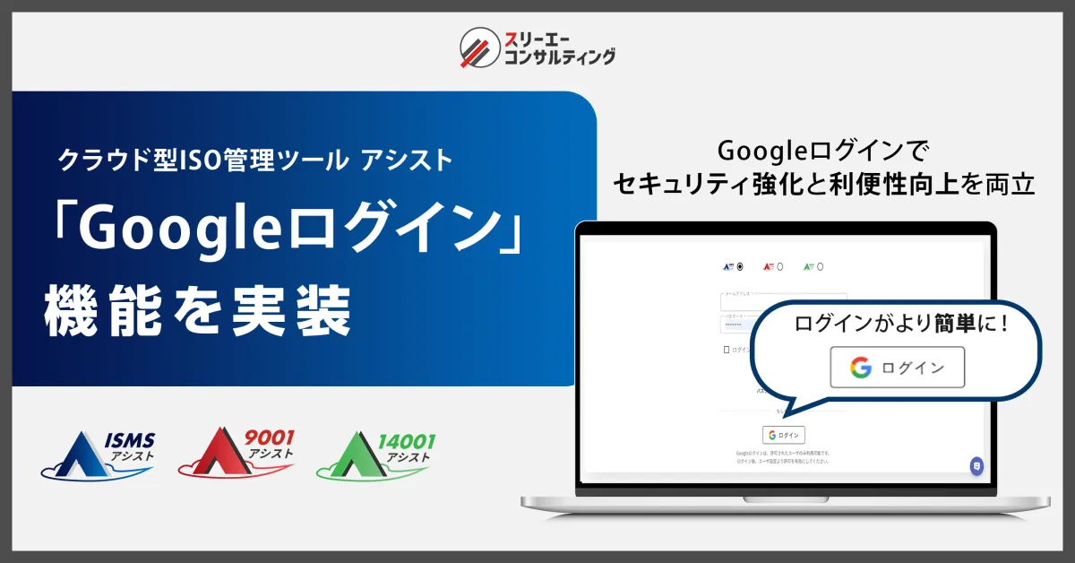 株式会社スリーエーコンサルティングが提供するクラウド型ISO管理ツール『ISMSアシスト』『9001アシスト』『14001アシスト』において、ユーザーの利便性を向上させる新たな機能が追加されました。この度のアップデートで新たに導入されたのは、「Googleアカウントを利用したシングルサインオン(SSO)ログイン機能」です。