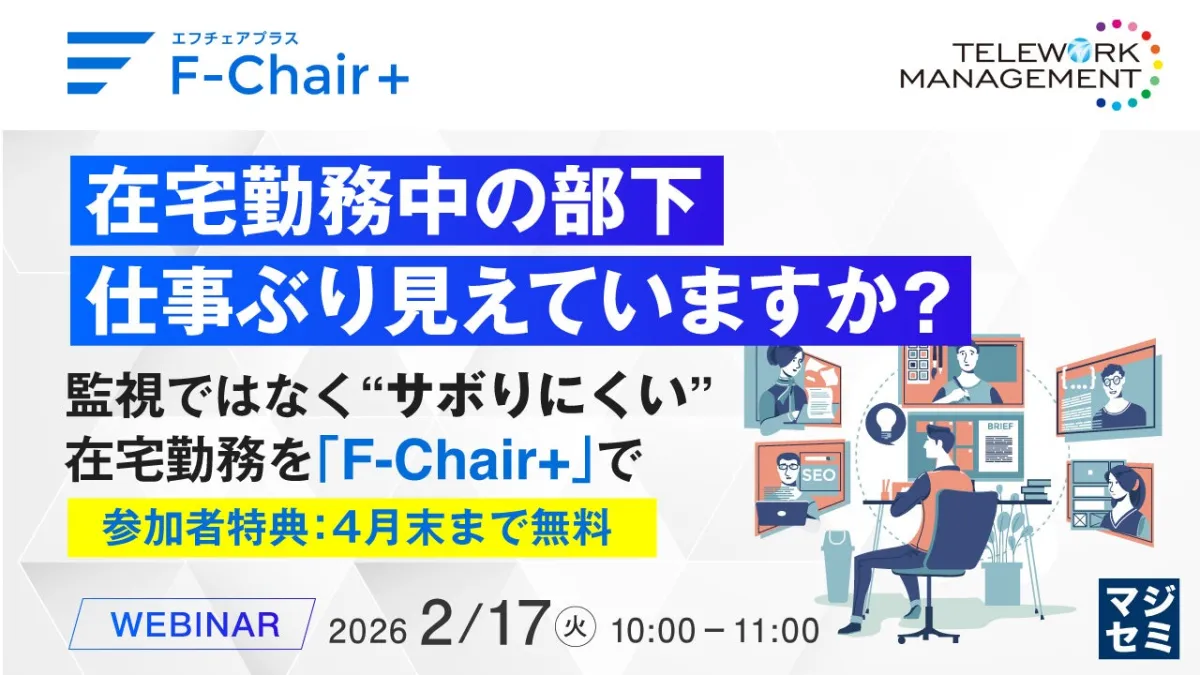 実際、「F-Chair+」の導入により、社員がサボりにくくなるだけではなく、業務の進捗管理もスムーズに行えるとの声が寄せられています。テレワーク下での柔軟な勤務体制を実現するための具体的な手法を当セミナーで学び、効果的なマネジメントを実践できる機会となるでしょう。