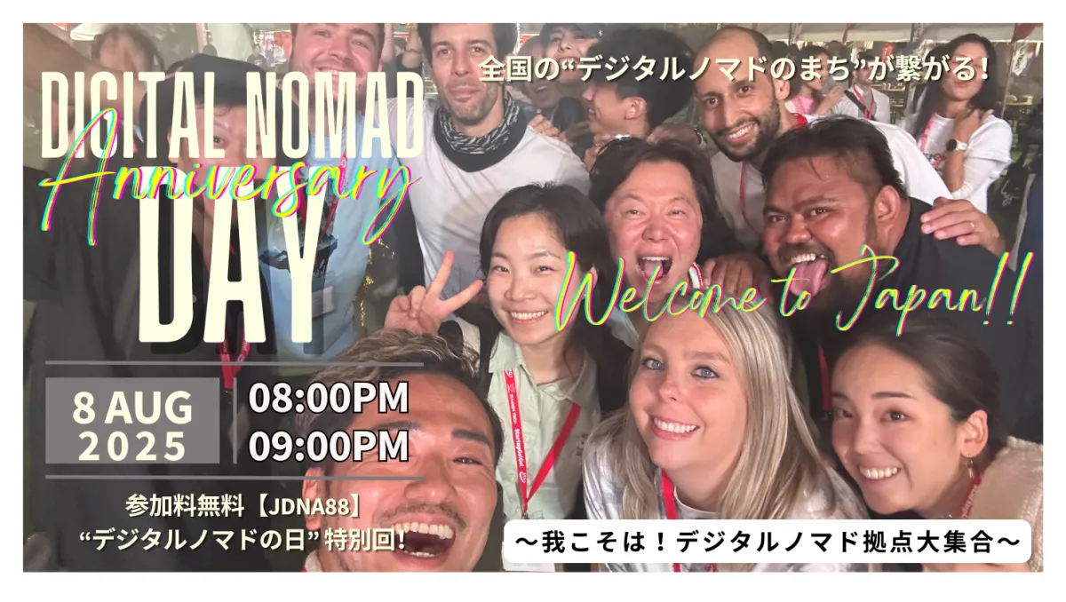 2025年8月8日、日本におけるデジタルノマド文化を祝う特別な日がやってきます。この日は一般社団法人日本デジタルノマド協会(JDNA)が、全国のデジタルノマド受入拠点が一堂に集まるオンラインイベントを企画しています。このイベントは、受入拠点がリアルおよびオンラインでつながる特別な機会であり、デジタルノマドの未来をともに考える場となります。