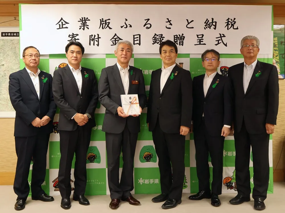 タケエイは、林野火災の被害を受けた地域への支援として、企業版ふるさと納税を活用し、岩手県と大船渡市に対して各1,000万円の寄附を行うことを決定しました。この寄付は、森林災害復旧事業や林野火災支援に役立てられます。2月の寄附金目録贈呈式では、岩手県の佐々木淳副知事や大船渡市の渕上清市長にタケエイの阿部光男社長が目録を手渡しました。