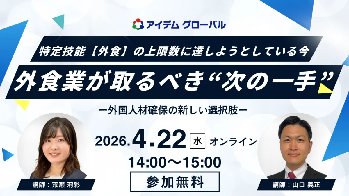 外食業界では、特定技能「外食」の上限数が迫ってくる中で、人材確保が急務となっています。この状況を受けて、株式会社アイデムが提供するオンラインセミナーが注目を集めています。この無料セミナーでは、外国人採用における新たな手法や、特に最近注目されている「外国人大学生インターンシップ制度」について詳しく解説します。