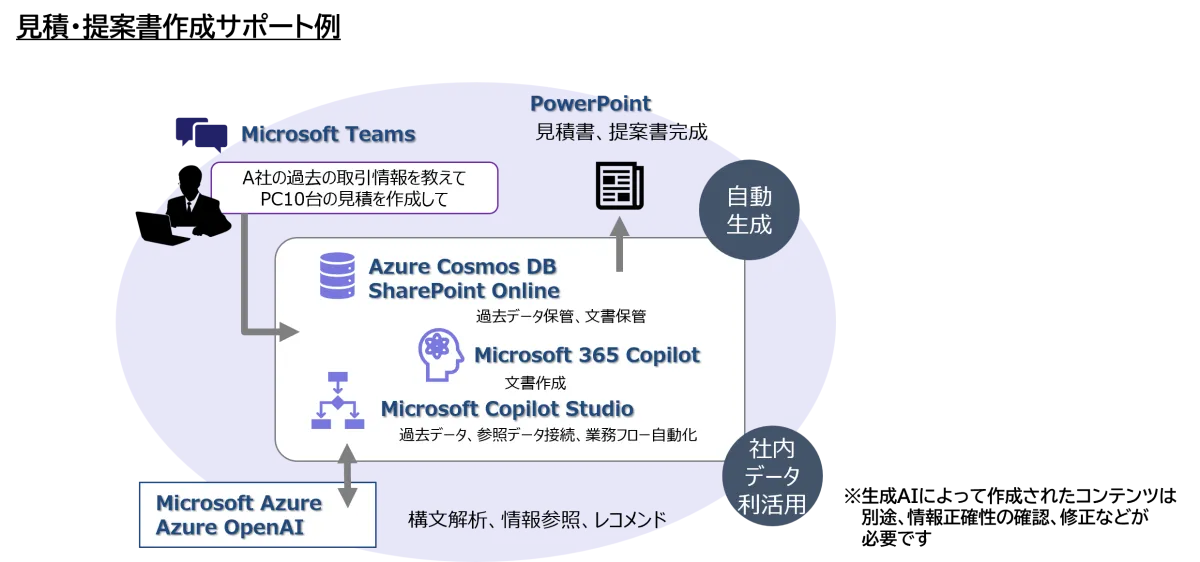 営業業務向けのAI活用サービスでは、生成AIが顧客情報の収集から、見積書や提案書の作成を大幅に効率化することが可能です。具体的には、既存の営業支援システム(SFA)や顧客管理システム(CRM)とMicrosoft 365 Copilotを連携させることで、Microsoft Teamsを介したチャット形式での指示出しが実現されます。