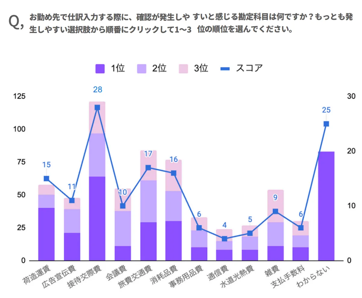 報告書では、仕訳入力時に確認が必要とされる勘定科目についても調査が行われました。最も多く選ばれたのは「接待交際費」で、続いて「旅費交通費」や「消耗品費」が上がってきており、これらの項目は確認が必要であることが理解されました。また、「会議費」や「雑費」など比較的自由度の高い費目でも、分類基準や記載内容のあいまいさから、判断に悩むケースが多いことが示されました。