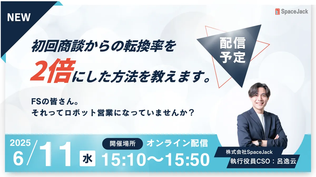 2025年6月11日(水)に、株式会社SpaceJackによるオンラインセミナーが行われます。このセミナーでは、元キーエンスのエキスパートが「初回商談からの転換率を2倍にする方法」について解説します。商談の設置から受注まで、マーケティング施策としてのBDRを考え、営業の課題を解決するヒントが満載です。