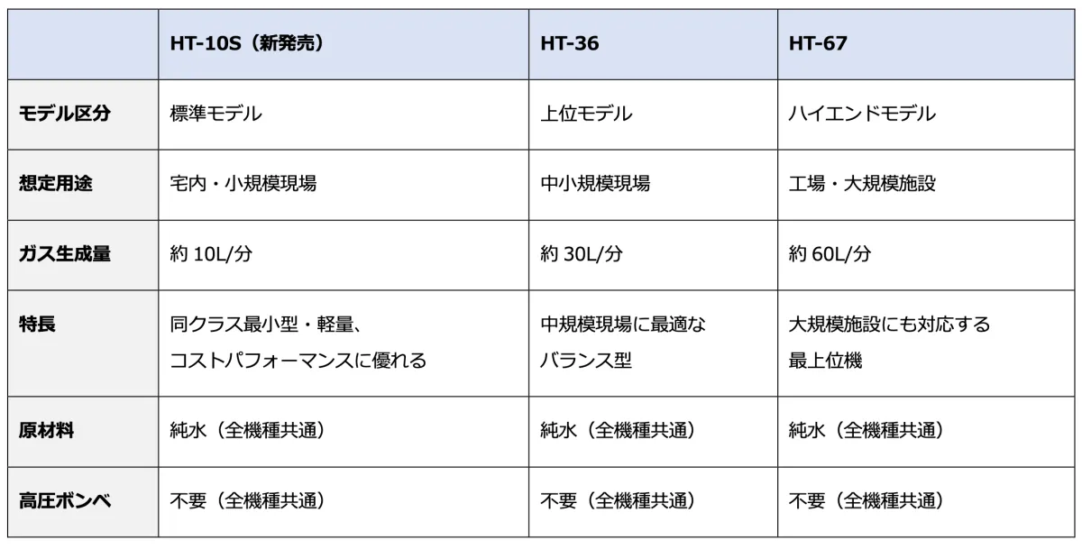 - - コスト面での優位性:原材料が純水のみで、ランニングコストを抑えることができ、ガス切れの心配がありません。