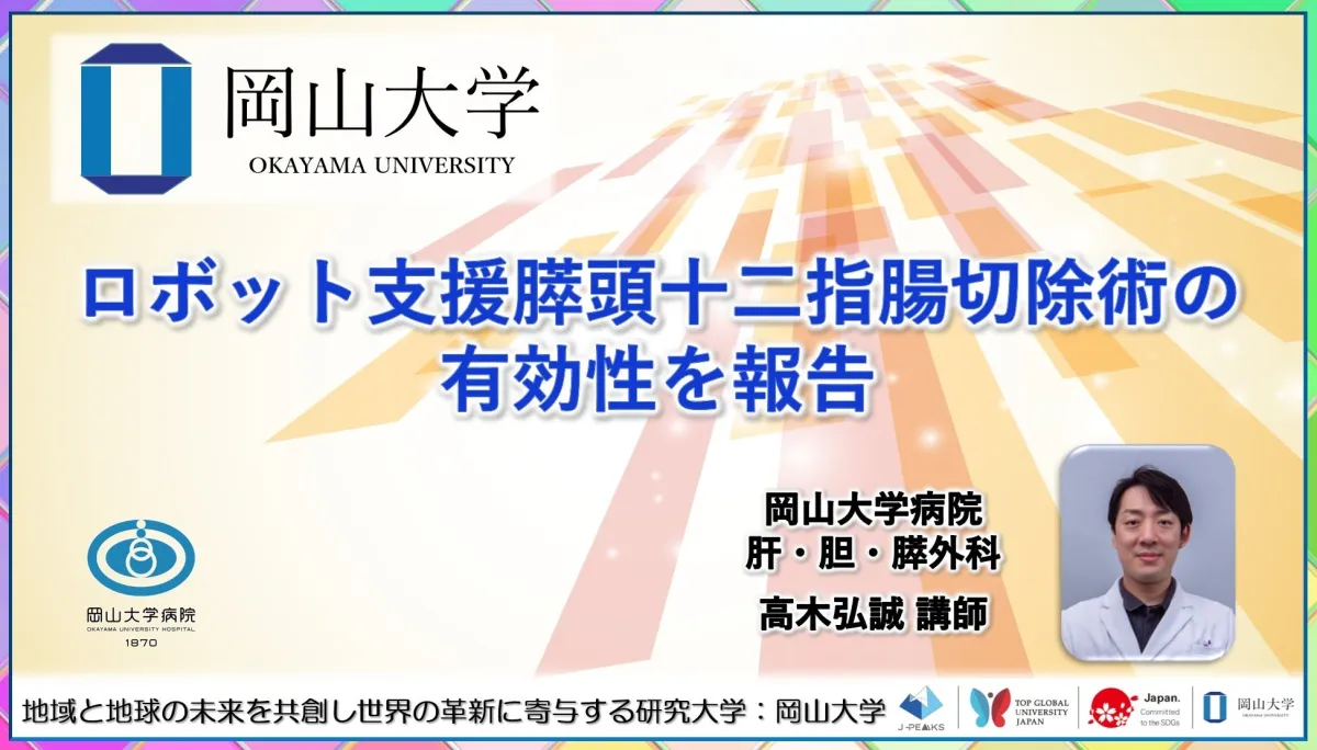 高木講師の研究チームは、2017年から2025年にかけて岡山大学病院で行われた膵頭十二指腸切除術の患者400人を対象に、ロボット手術と開腹手術の比較研究を実施しました。その結果、ロボット手術を受けた162人の患者は、開腹手術を受けた238人に比べて有意に合併症が少なく、術後入院期間も短縮されました。この研究成果は、2026年2月に欧州のがん関連研究学術誌「Cancers」に掲載されました。