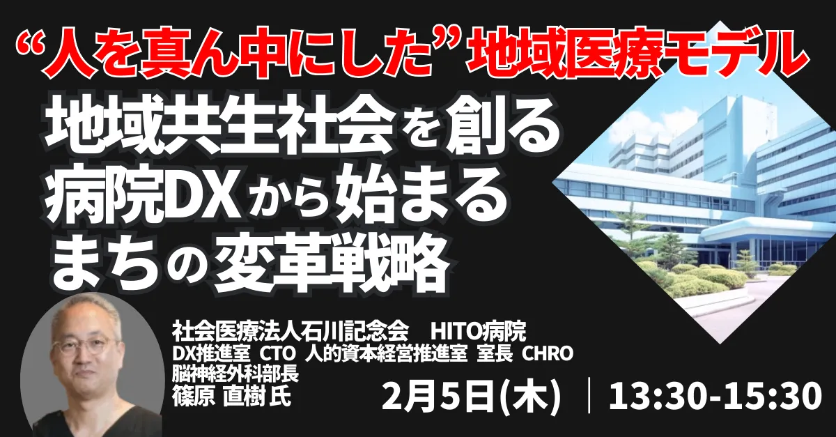 2026年2月5日、JPI(日本計画研究所)は、石川記念会HITO病院の篠原直樹氏を講師に招き、「地域共生社会を創る~病院DXから始まるまちの変革戦略」というテーマのセミナーを開催します。このセミナーは、医療機関が「治療の場」から「地域の未来を共創するプラットフォーム」へと進化する必然性を解説し、デジタル変革(DX)の役割を考察します。