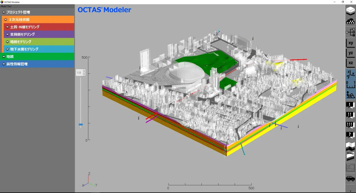 『OCTAS Modeler』では、ボーリングデータの位置関係を3次元で視覚化し、ボーリングモデルや地質区分モデル、支持層モデル、地形サーフェスモデルなど、さまざまな地盤モデルを容易に作成できます。ユーザーは簡単な手順で建設現場に即した3次元地質モデルを構築し、地盤情報をオープンフォーマットで一元的に管理できるため、情報の共有がスムーズになります。