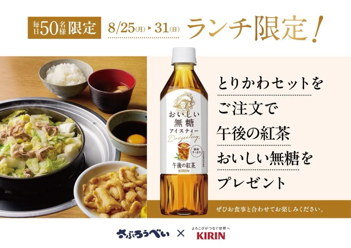 このコラボイベントは、2025年8月25日(月)から31日(日)の7日間にわたり、さぶろうべいの5つの店舗にて開催されます。ランチタイムに「とりかわセット」を注文したお客様の中から、先着50名に「午後の紅茶 おいしい無糖」を無料でプレゼント。嬉しいことに、これは期間中毎日実施されます。