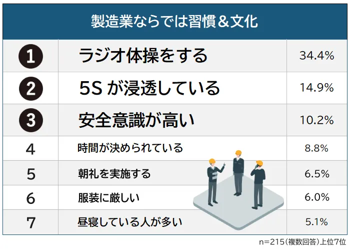 調査は2025年6月に実施され、215人の回答をもとに製造業の現場での習慣や文化についての意識を探っています。