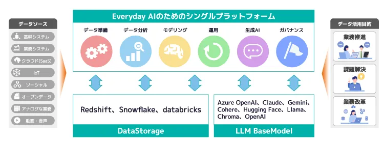 Dataikuは、データの準備や分析、機械学習モデルの構築から、生成AIの実装、さらには運用管理やガバナンスに至るまで、すべてのプロセスを一元的に管理することができます。具体的には、以下の特徴があります: