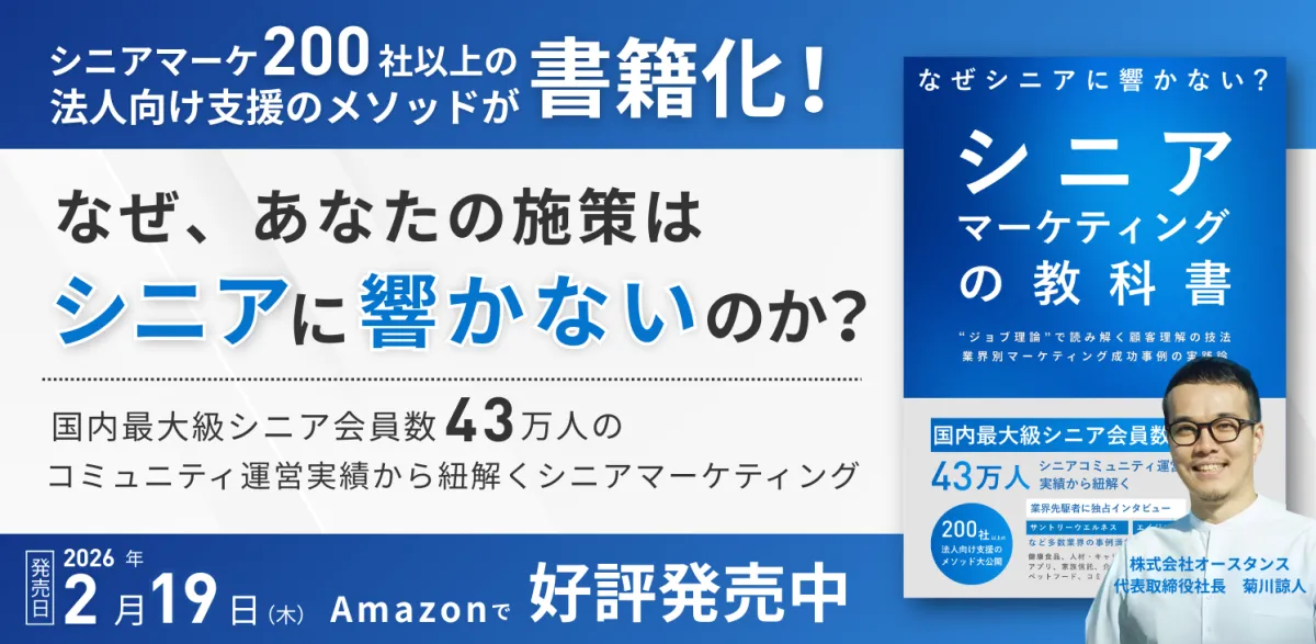 シニア市場が拡大し続けていますが、その一方で多くの企業は売上の伸び悩みを抱えています。特に、従来のマーケティング手法がシニア層に通用せず、どのようにアプローチするべきか悩んでいる方も多いでしょう。そんなニーズに応えるべく、株式会社オースタンスが出版した書籍『シニアマーケティングの教科書』が、2026年2月19日よりAmazon Kindleで発売されます。