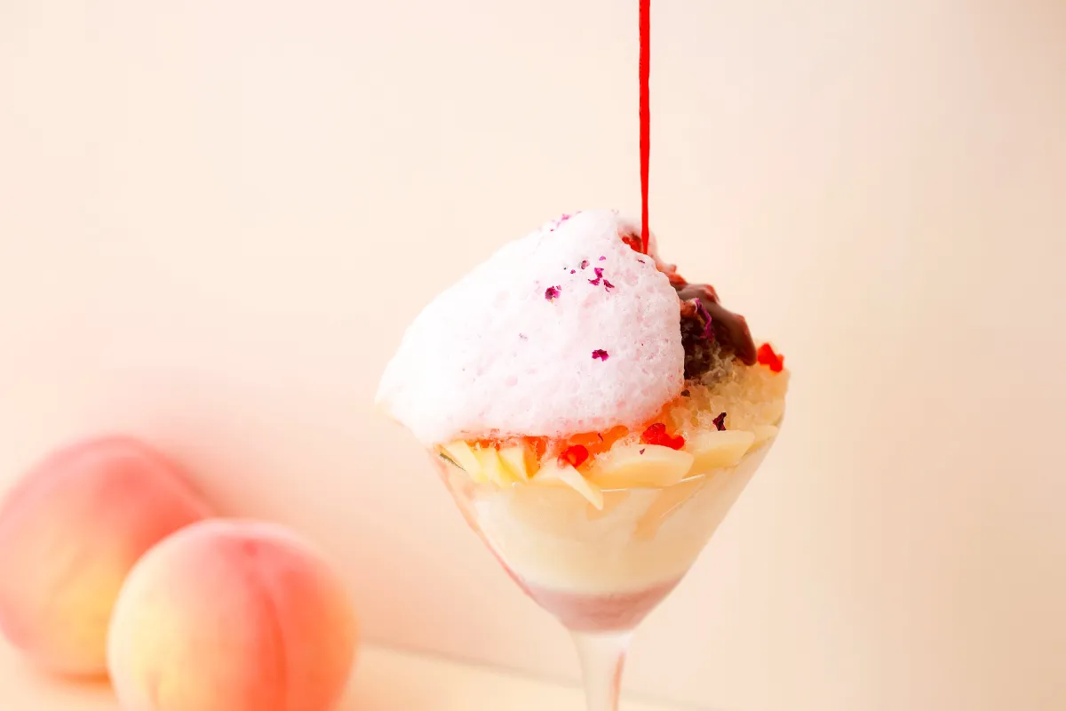 今回のかき氷には、和歌山県のブランド桃「あら川の桃」と、滋賀県のブランド木イチゴ「オウミ木イチゴ」が使用されています。これら二つのブランド果実は、各地の夏の魅力を凝縮した素晴らしいフレーバーを提供し、特別な夏のデザートとしての存在感を与えています。
