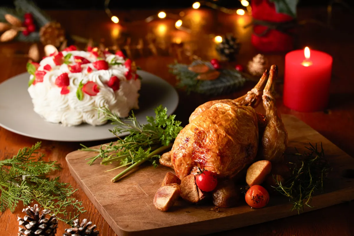 続いて、クリスマスローストチキンも注目です。国産の若鶏を丸ごとじっくりと焼き上げ、中には豊かなトリュフの香りと、もち米や雑穀が詰まっています。この特製ローストチキンの魅力は、香ばしい醤油と旨味を凝縮したフォンドヴォーをブレンドした特製ソースが味の決め手。仕上げにレモンバームやミント、セルフィーユが添えられ、見た目にも華やかです。