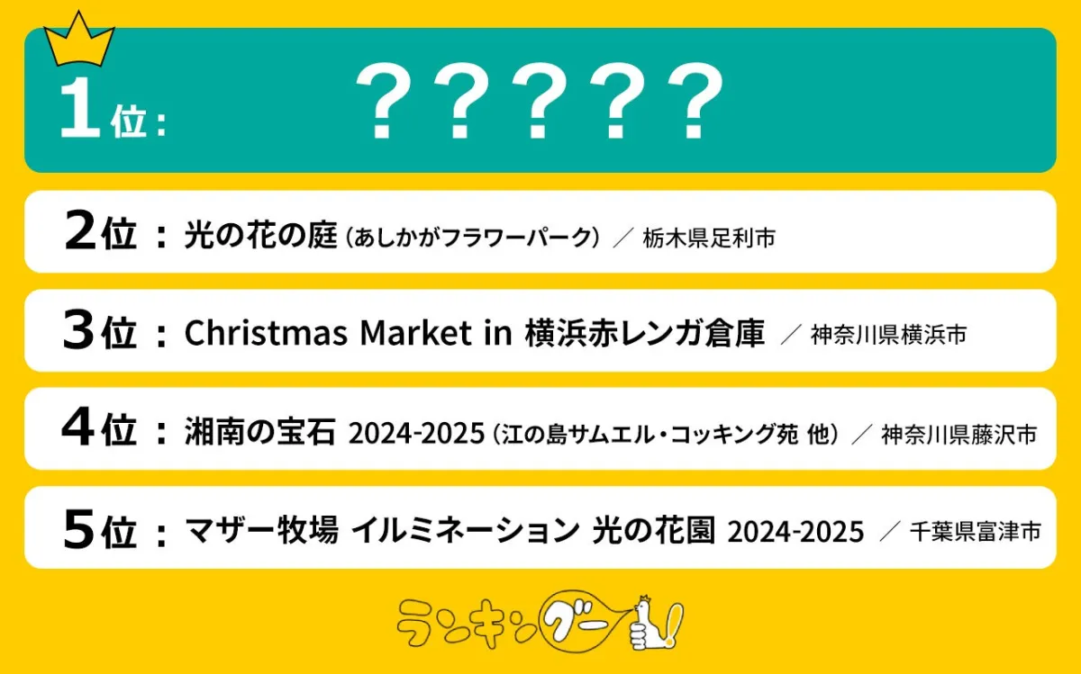 そして5位を獲得したのは、千葉県富津市の『マザー牧場イルミネーション光の花園2024-2025』です。「テレビで見たけど、すごかった!」とのコメントのように、こちらも訪れる人々を虜にする美しい風景が広がっています。前述の他にも魅力的なスポットが多く選ばれており、ランキングの詳細は次のURLにて確認できます。