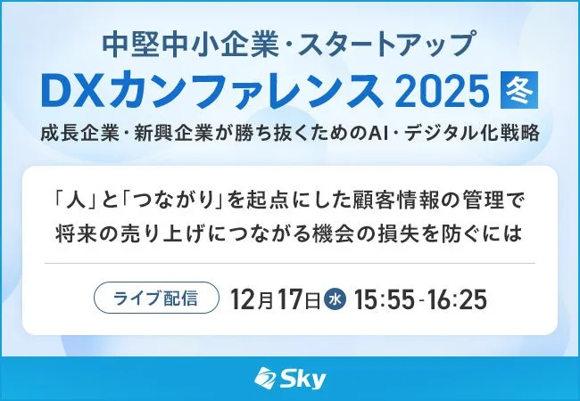 このイベントにはスカイ株式会社が協賛しており、同社のICTソリューション部門から、リーダーの小澤風花氏が講演を実施します。講演テーマは「人」と「つながり」を起点にした顧客情報管理で、将来の売上につながる機会の損失を防ぐ方法です。