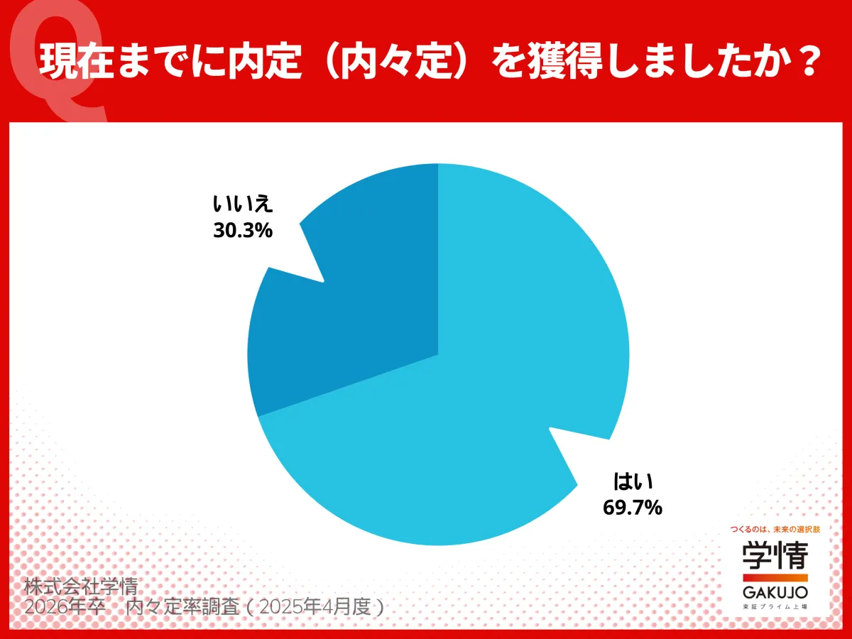 今回の調査によると、2025年3月末時点での内々定獲得率は69.7%で、2025年度の卒業生よりも1ヶ月早いペースであることがわかりました。特に企業の就活における人材獲得競争が激化している影響で、3月に入ってからの内々定の出し方が急激に進行したのです。3月1日の採用広報解禁に伴い、多くの企業が早々に内々定を出す動きが見られました。