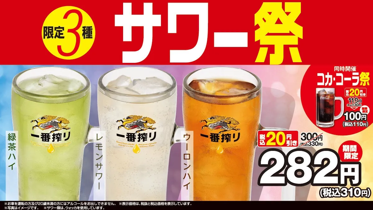 昨年に引き続き開催される「サワー祭」では、人気のドリンクが期間限定でお得に楽しめます。今年のラインナップは「レモンサワー」「緑茶ハイ」「ウーロンハイ」の3種類。各ドリンクが通常価格から20円引きで提供され、お財布にも優しいチャンスです。