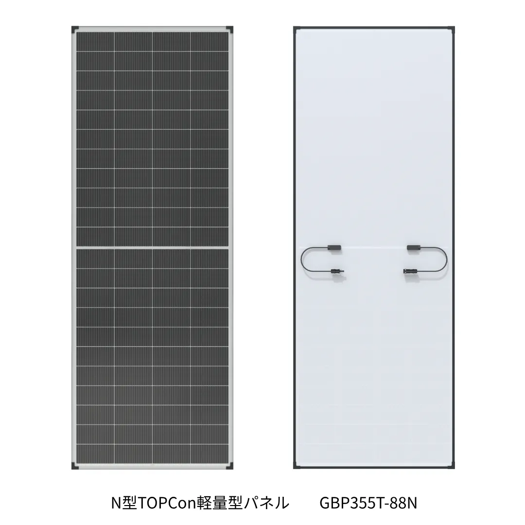この「GBP355T-88N」は、非常に軽量で、一般的な太陽光パネルの半分近くの重さを誇ります。具体的には、パネルの重量は1平方メートルあたりわずか5.6kg。この軽さにより、従来の屋根の耐荷重制限に左右されることなく、スムーズに設置が可能です。新たに導入された高効率のN型TOPCon電池を使用しており、その発電効率は21.3%という高数値を記録しています。