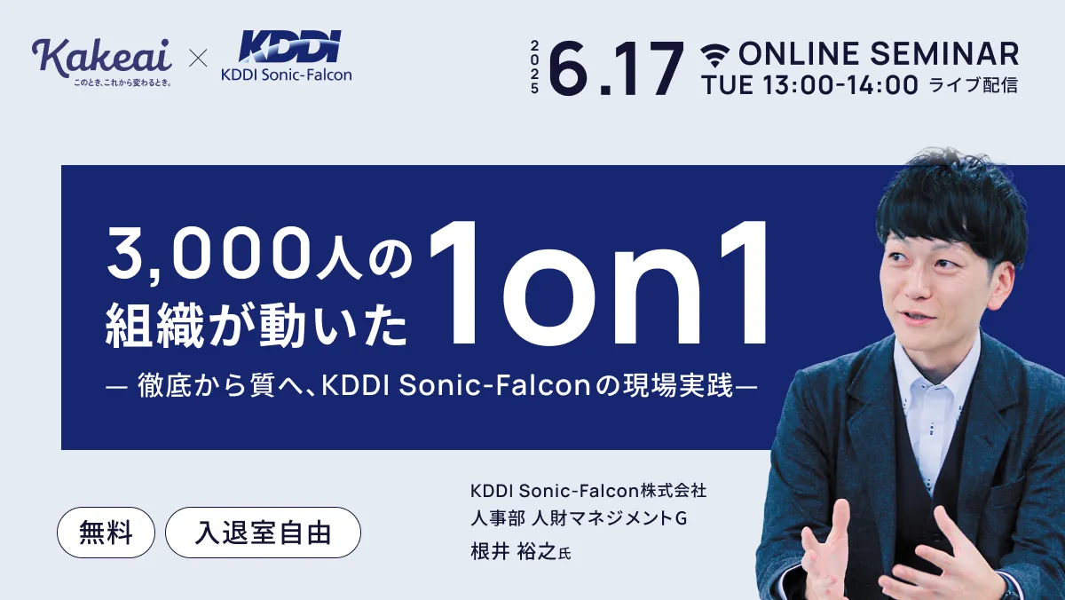 このたび、株式会社KAKEAIが主催し、KDDI Sonic-Falcon社と共催するオンラインセミナーが2025年6月17日(火)に開催されます。セミナーのタイトルは「3,000人の組織が動いた1on1」であり、参加者は全社で1on1を導入し、実施率95%を誇るKDDI Sonic-Falcon社の成功事例を学ぶことができます。