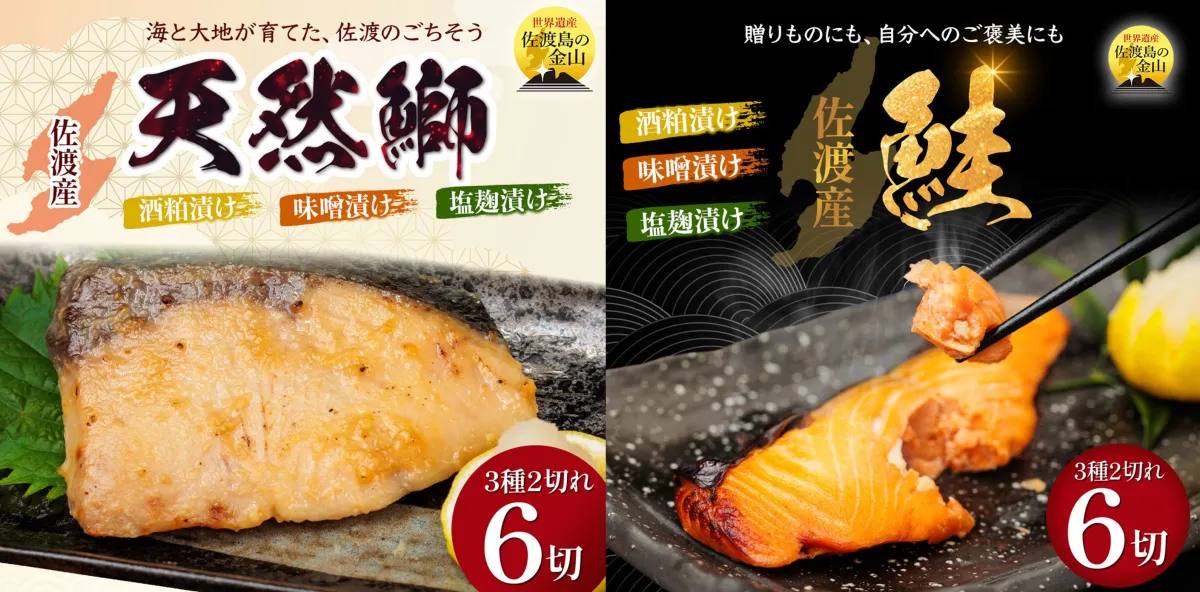 「日本海の宝・佐渡から届く、極上の海の幸」の内容は、鰤と鮭の3種セット(各2切れ、合計6切れ)です。寄付額は鰤が10,000円、鮭が13,000円。申し込みは公式HPから可能です。