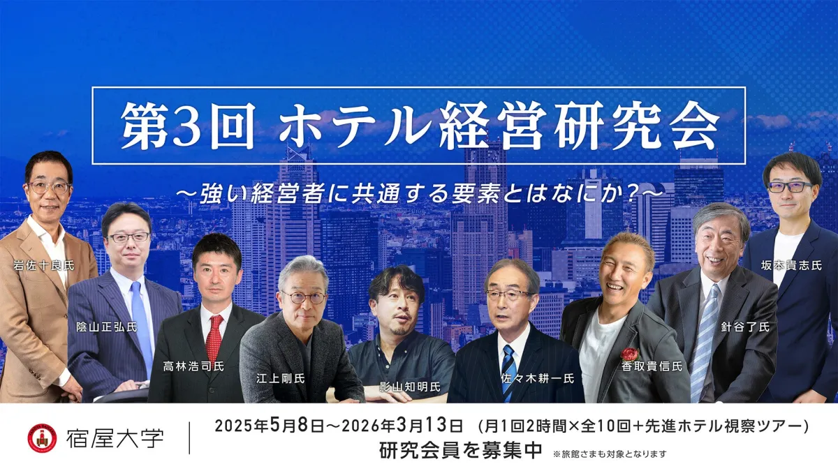 宿泊業界の未来を担う経営者を育成するため、株式会社宿屋塾が2025年5月8日から1年間にわたり「第3回ホテル経営研究会」を開催します。この研究会は、経営者に必要な長期的な視点や倫理的な経営を重視し、業界の変革に対応できるリーダーの育成を目指します。
