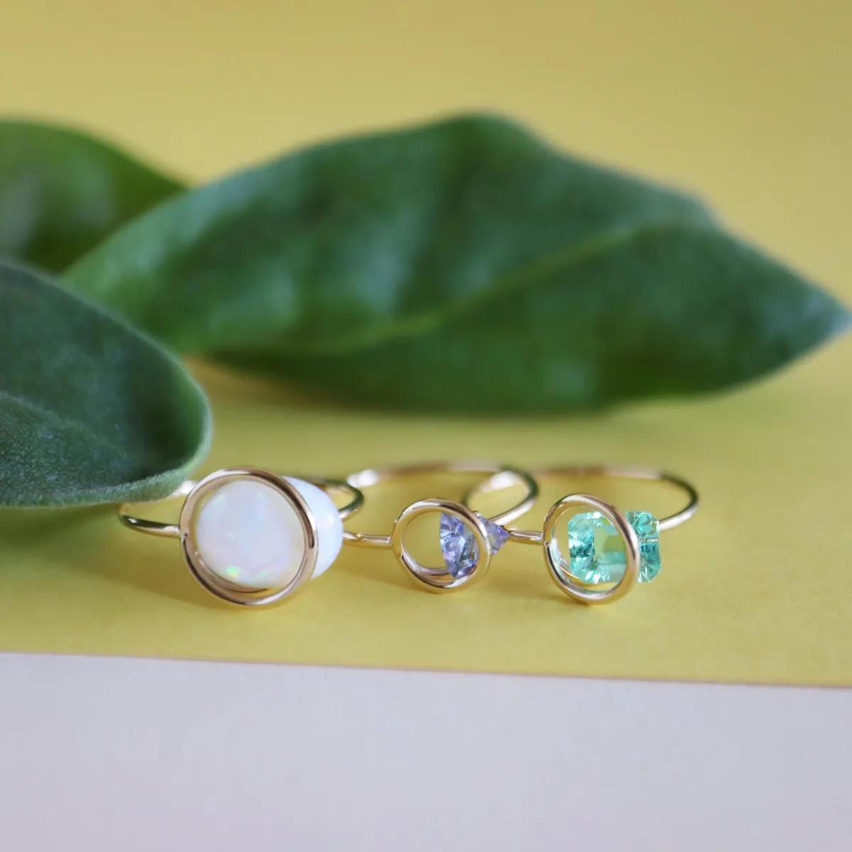 このポップアップイベントの期間中は、特に春にぴったりのカラーセレクションが揃います。グリーンベリル、ムーンストーン、ピンクトルマリンといった爽やかな色合いの天然石を用いた作品が並び、春の訪れを感じさせてくれるでしょう。特にオリジナルの石留め技法を使った”Protrude”、”Circle”、”Luna”というデザインは、光を取り込んで美しい輝きを放ちます。