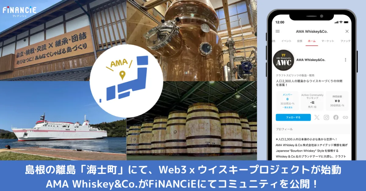 島根県隠岐諸島に位置する海士町は、新たにウイスキープロジェクト「AMA Whiskey&Co.」を立ち上げ、Web3技術を利用したコミュニティ参加型の試みを開始しました。この度、フィナンシェのプラットフォームを利用して、トークンを発行し、地域の魅力を引き出すパートナーシップを促進を目指します。