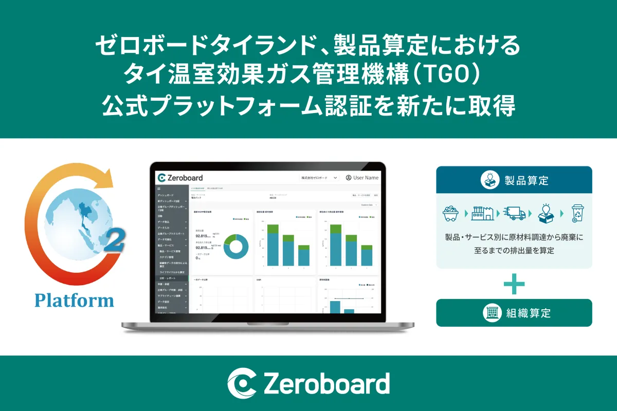 Zeroboard (Thailand) Co., Ltd.が、タイ王国の温室効果ガス管理機構(TGO)から製品算定におけるカーボンフットプリント報告プラットフォームとしての認証を受けました。この認証は、ゼロボードのGHG排出量算定・可視化ソリューションである「Zeroboard」が、組織算定に続いて製品算定でも信頼性の高い報告が行えることを示しています。