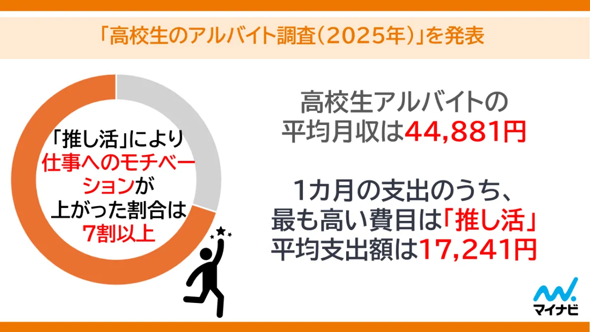 調査から得られたデータによると、高校生のアルバイトの平均月収は44,881円ですが、支出状況は意外にも「推し活」が最も高い支出項目であり、平均支出額は17,241円という結果に。これは、彼らが友人との交流や趣味にお金を使う傾向が非常に強いことを示しています。