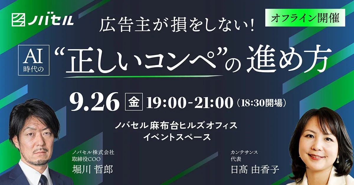 ノバセル株式会社が2025年9月26日(金)に麻布台ヒルズオフィスで開かれるセミナーで、広告主が広告運用を成功させるための「正しいコンペ」の進め方を学ぶことができます。本セミナーは、広告主が正しいオリエンを主導する重要性と、そのための具体的な手法について解説する内容となっています。