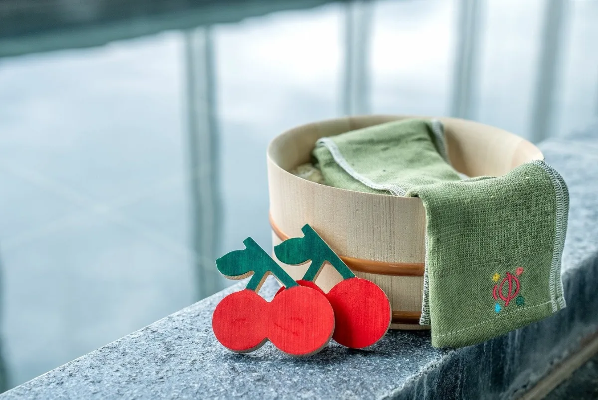 特に、天童木工が手掛けた「檜のさくらんぼ」は、浴槽に浮かべることで檜木特有の爽やかな香りが広がり、リラックス効果を高めてくれます。また、さくらんぼ型の可愛らしいデザインは、初夏の優雅さを演出し、訪れるすべての人に特別な癒しの空間を提供します。従業員が一つひとつ丁寧に手作業で色を付けた木札も、温もりを感じさせてくれる仕掛けです。