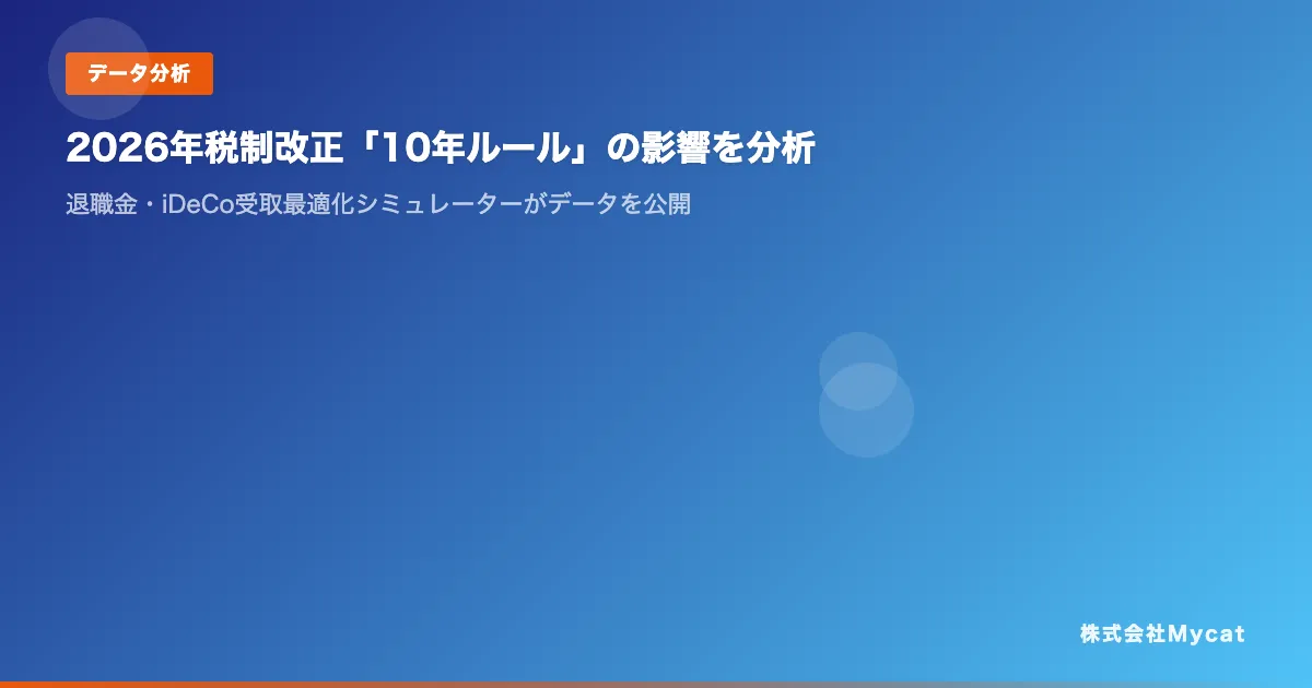 株式会社Mycatが提供する「退職金・iDeCo受取最適化シミュレーター」は、2026年に予定されている税制改正における「10年ルール」の影響を分析したデータを公表しました。このルールの変更がどのように退職金やiDeCoの受給に影響を与えるのか、具体的な数字を交えて解説します。