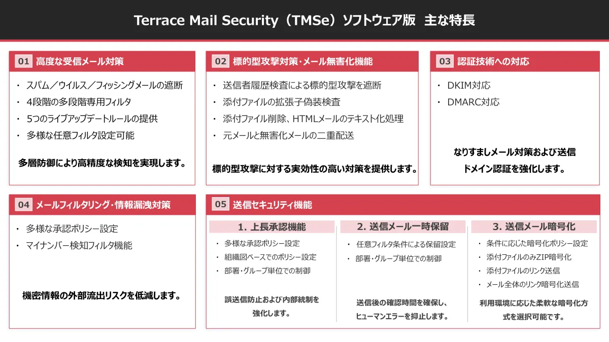 新しい『TERRACE MAIL Security』では、スパムやウイルス、フィッシングメールに対する包括的な防御機能が充実しています。四段階の多段階フィルタリングシステムを採用し、五つのライブアップデートルールにより、常に最新の脅威からの防御が行われます。ユーザーは多様な任意フィルタを設定可能で、高精度な検知を実現しています。