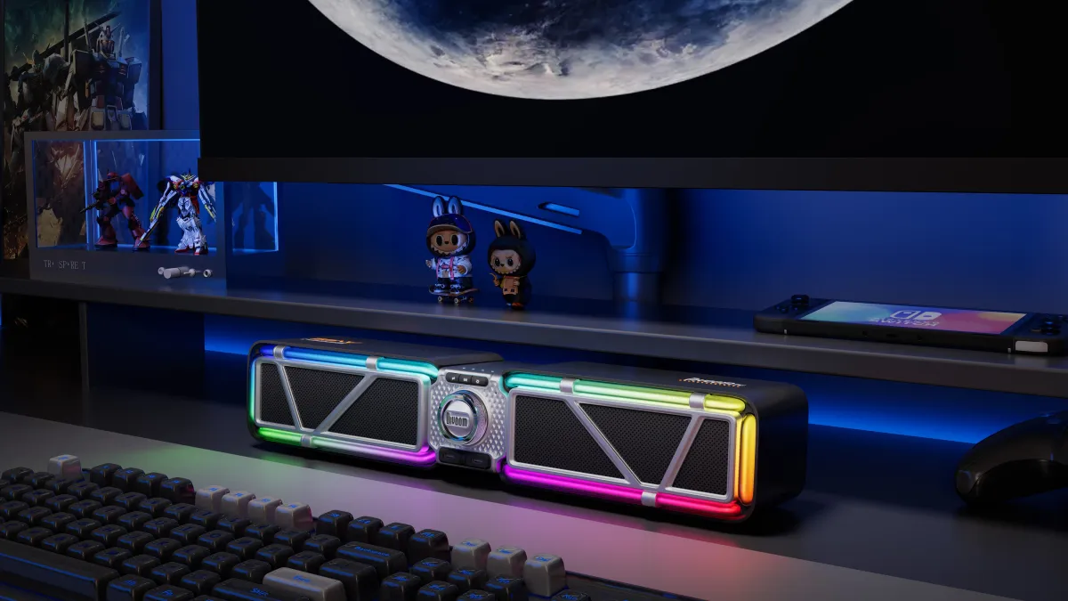 本体の高さはわずか74.43mmと非常にコンパクトで、デスクトップやモニターの下にフィットします。スペースを取らずに設置できるため、どんな部屋でも使用しやすいデザインです。また、重量は1,300gで持ち運びも簡単です。使用シーンに応じて、リビングからゲーミングルームまで幅広く活用できます。