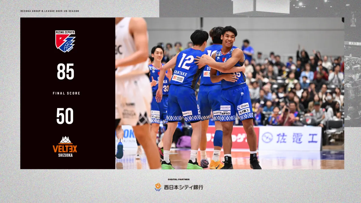 2026年4月26日、りそなグループB.LEAGUE 2025-26シーズンの最終節で、ライジングゼファーフクオカがベルテックス静岡との対戦に臨み、85対50で圧勝を収めました。福岡はこの勝利で、シーズンの締めくくりにふさわしい結果を残しました。