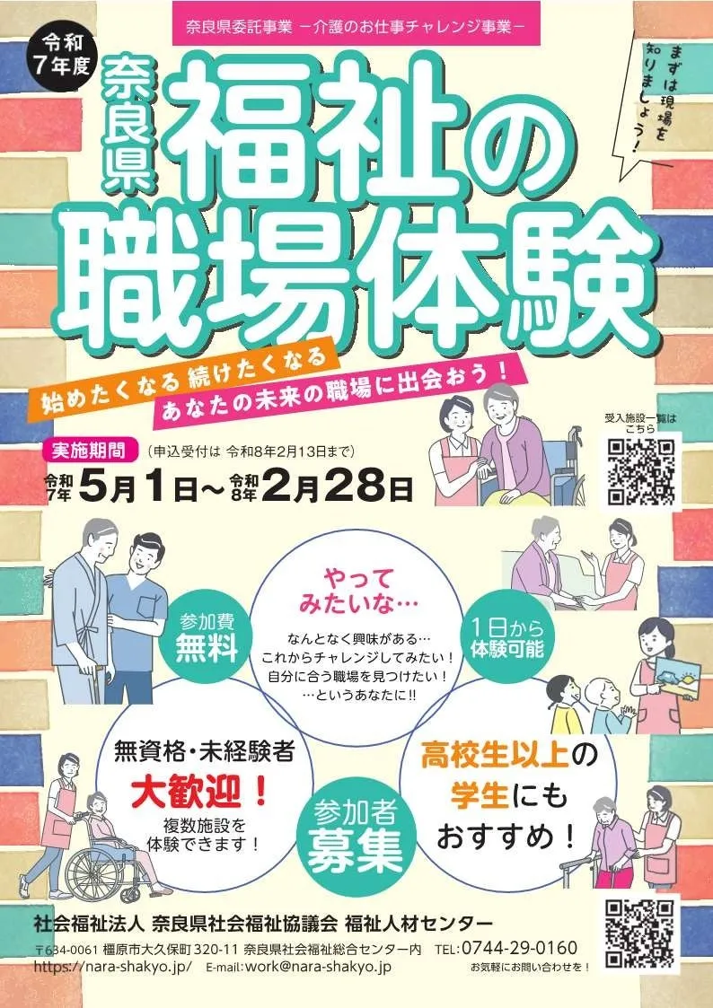 福祉の仕事に興味がある皆さんに朗報です!奈良県内の福祉施設では、「福祉の職場体験」と題したプログラムを実施します。これを通じて、福祉の仕事の実際に触れる貴重な機会を提供します。