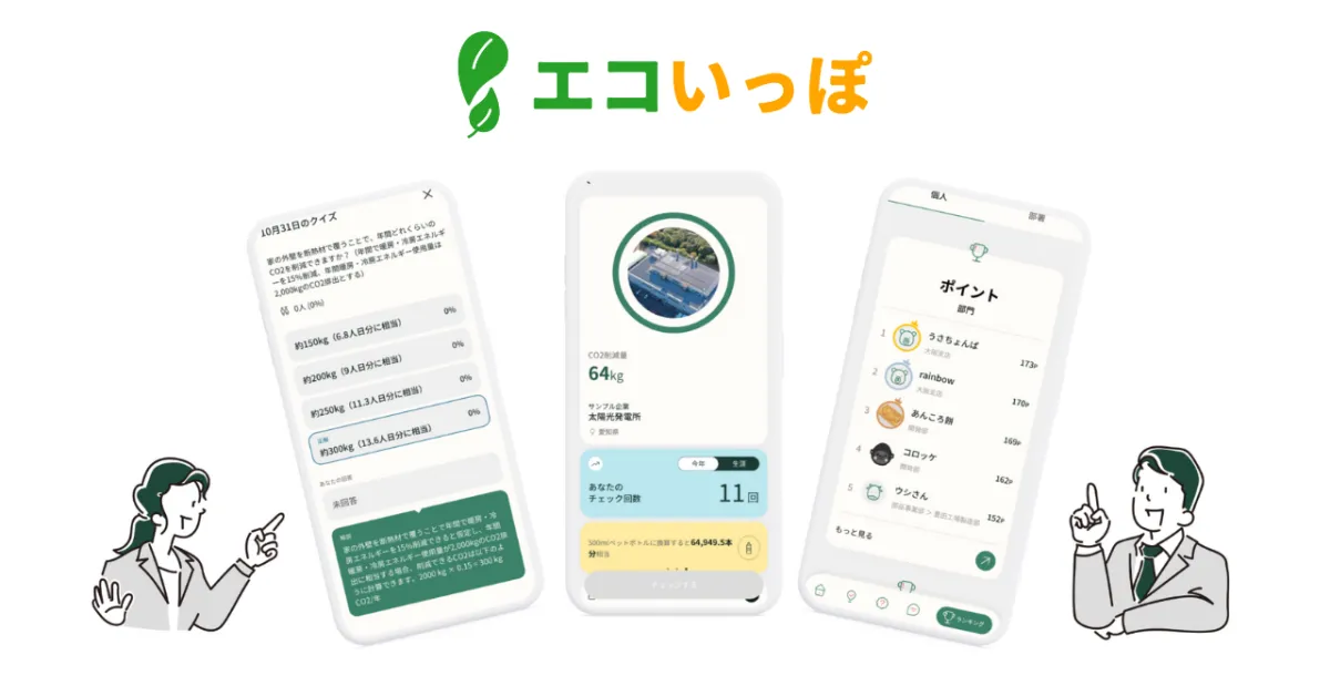 「エコいっぽ」は、特に製造業の従業員を念頭に置いたサービスであり、利用者が環境意識を高めるための多彩な機能を備えています。具体的には、「環境クイズ」や「数値チェック」、「エコアクション投稿」といった独自の機能をカスタマイズして利用することが可能で、各企業の取り組み内容やGX(グリーントランスフォーメーション)への対応に応じた柔軟な運用ができるのが特徴です。