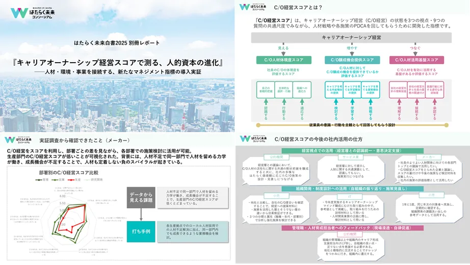 導入実証レポートによると、「C/O経営スコア」は企業が人材の育成と活用に役立つ新たなマネジメント指標です。このスコアは、企業が自社の「キャリアオーナーシップ人材」をどれほど活用できているのかを評価するために開発されました。スコアの活用により、企業は人的資本を最大化し、持続的な成長を実現するための指標を得ることができます。