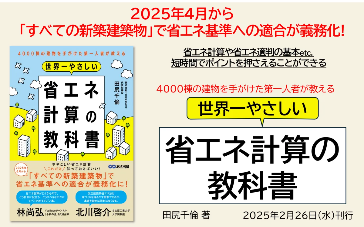 2025年4月より、日本の全ての新築建築物に対して省エネ基準への適合が求められることが決定しました。この新たな法改正を受け、建築業界は大きな変革を迎えようとしています。そんな中、田尻千倫氏が著した『4000棟の建物を手がけた第一人者が教える 世界一やさしい省エネ計算の教科書』が2025年2月26日に刊行されます。これは、省エネ計算の基本や省エネ適判の理解を深めるための非常に役立つ一冊です。