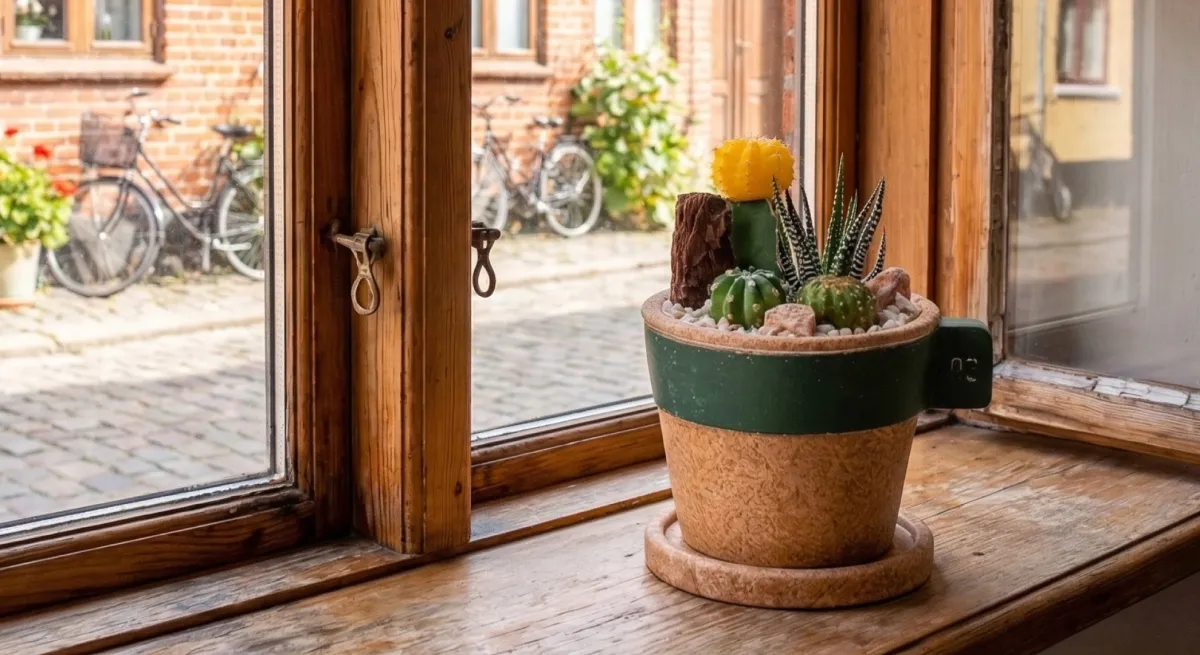 このサボテンは、まるでこぢんまりとした石畳の街を切り取ったかのようなデザインが施されています。細部にわたる工夫が魅力で、各鉢が異なる風景を持っている点も楽しみの一つです。色合いや質感が自然体で、どんなインテリアにも心地よくフィットします。