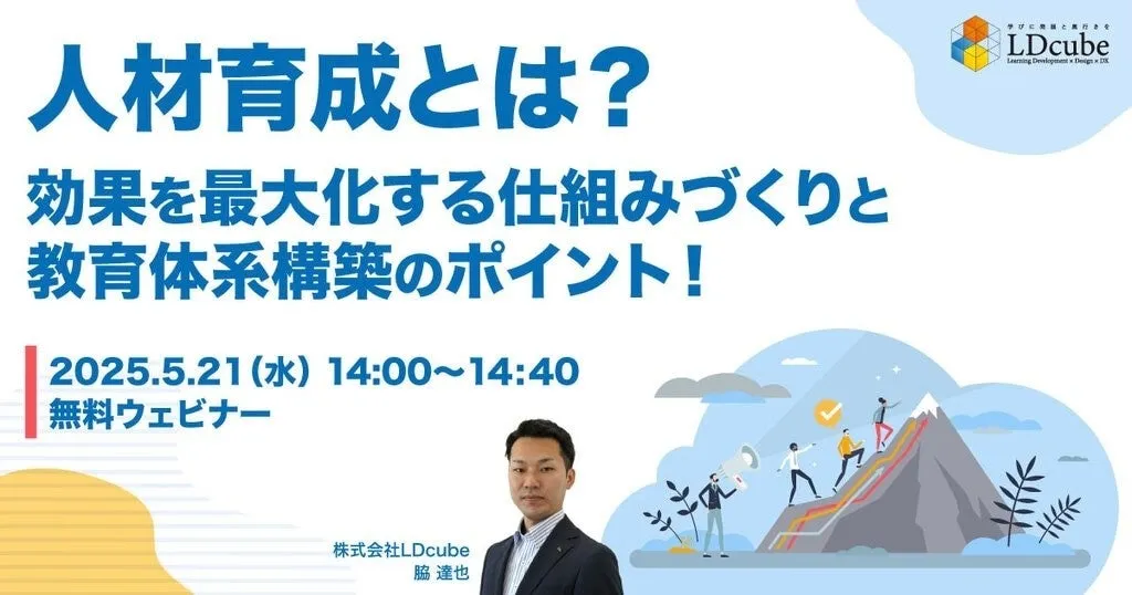 企業における人材育成は、単なる選択肢ではなく、競争力を維持・強化するための必要不可欠な要素です。株式会社LDcubeは、2025年5月21日に「人材育成とは?効果を最大化する仕組みづくりと教育体系構築のポイント!」という題名の無料ウェビナーを開催します。このウェビナーは、特に人事担当者やこれから人材育成に携わる方々を対象としています。